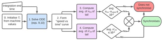 Once the solution to the ODE has been computed, the motor’s speed versus time graph can be extracted. Two cases can arise: The first case being when synchronization occurs, resulting in the motor’s speed settling around its rated speed . The second case arising when the motor fails to synchronize; the speed oscillating below rated speed. Both cases are visualized in Figure 7.