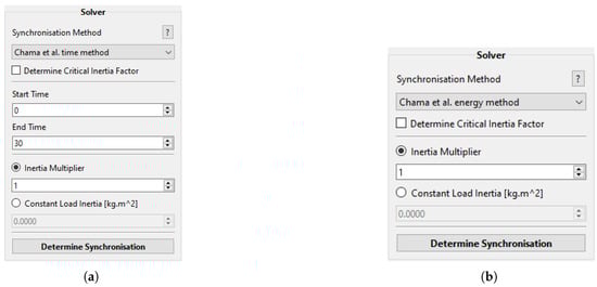 In order to compare the critical inertia factors produced by each method, the actual critical inertia factors of the test machines need to be determined. This was conducted through a binary search approach using transient FE analysis. The values determined by this process can be seen in the column labelled “FEM” in Table 1 and represent the target which the analytical methods aim to meet. For the three different analytical methods, each method follows a somewhat different approach for the critical inertia factor () determination. Rabbi et al.’s method, mentioned in Section 2.2.1, determined using (6), while both Chama et al. methods used a linear search approach. The linear search approach was implemented by simply increasing the load inertia by a factor, until this factor fails synchronization; the factor before that is .