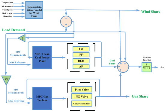 - A simplified and practically feasible operation and control strategy has been suggested for heavily loaded power systems: the wind farm output should be admitted to the network from economic and environmental view-points, the remaining load signal, heavily affected by the randomness of the wind, is instructed to the MPC controllers of the flexible generators (coal and gas), and the wind farm is relieved from duty of load frequency control because this obligation is completely carried out by the flexible units and their associated controls, which in turn, reduces the storage technology requirements of the wind turbines where that storage would be needed only in case of curtailed or low load.