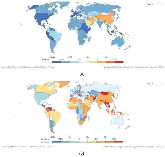 Annual percentage change in CO emissions: (a) 2020, (b) 2021.