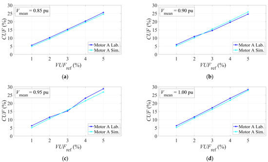 VUF2 according to Vmean and CUF for: (a) Test results for Motor A; (b) Simulation results for Motor A; (c) Simulation results for Motor B; (d) Simulation results for Motor C.