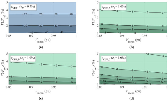 Applying (7) to all the unbalance points, Figure 5a shows the eVUF1 values by means of isolines. The vertical axis corresponds to the reference VUF (VUFref), and the horizontal axis to the mean value of the line voltages (Vmean). Right at the value where many standards mark the unbalance limit, VUFref = 2%, it is observed that the error in the calculation of the VUF through (6), when the measurement error in the effective value of the voltage is 0.7% (ev = 0.7%), can give rise to errors of 30% in the VUF (eVUF1=2% ≈ 30%).