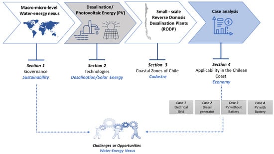 The methodology used has a set of analysis schemes detailed below (Figure 2). Section 1 presents the water-energy nexus, considering the governance and macro-micro levels applicable to the desalination technology and a PV. Section 2 presents the main desalination technologies around the world, supported by solar PV, as well as some calculations relevant to this study. Section 3 reports the small-scale desalination plants in Chile and around the world, considering the applicable regulatory framework and the costs according to the specific energy consumption (SEC). Section 4 presents the results of a survey of the desalination plants in the coastal areas of Chile, through the review of multiple records and databases available at the Environmental Assessment Service, SEA [], and the journalistic information issued by public and private organizations. Subsequently, an economic analysis of a reverse osmosis desalination plant (ROPD) that produces drinking water on a small scale is carried out. For this purpose, it is evaluated through four cases with different energy configurations, Case 1: Electrical Grid; Case 2: Diesel Generator; Case 3: Photovoltaic system without battery; Case 4: Photovoltaic system with battery, that allow for sustaining the plant. The following aspects are considered: costs and energy conditions through a technical-economic analysis, using the software Solar Explorer [] and Homer Pro [], allowing to simulate the engineering and economic feasibility of the microgrids or distributed energy systems that are off-grid or connected to an unreliable grid, considering the design of lower cost energy and electrical systems, as well as the risk mitigation.