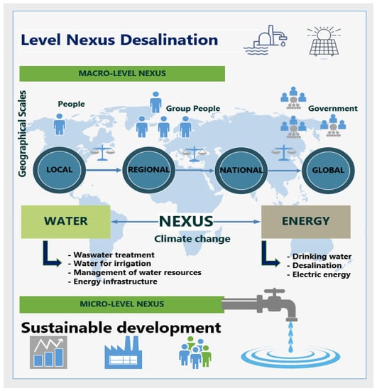 At the micro level, applying suitable technologies, such as desalination-photovoltaics, can contribute to avoiding environmental deterioration, improve the quality of life of the communities, and to have a more significant social and economic benefit, which leads to the sustainable development by applying this water-energy nexus.