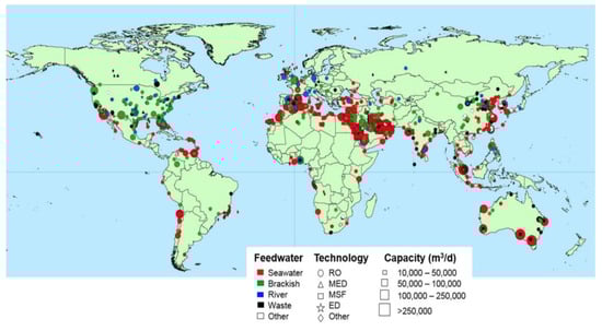 The governance of the water-energy nexus is fundamental for countries to access these resources, which are so precious today. Water is considered the “liquid gold of the planet”, essential for direct uses, such as irrigation, human consumption, industry, and indirect use to produce electricity. Desalination is a technology that allows for obtaining this vital element. In some parts of the world, combining renewable energy sources with the desalination technology is a cost-effective way of generating fresh water []. The most widely used technologies are solar photovoltaic energy and reverse osmosis desalination, which has the great potential to improve water sources in arid, semi-arid, and coastal areas, among others. Almost 1% of water desalination technology is powered by renewable energy [].