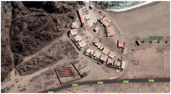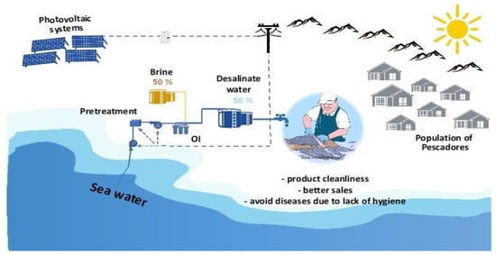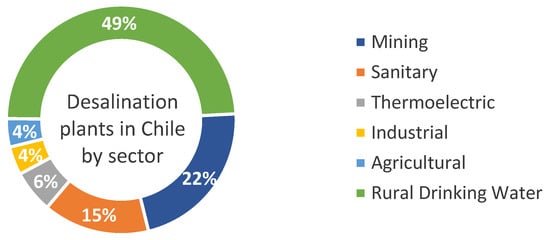 In response to this issue, through the MOP’s Rural Drinking Water Program (APR), community organizations can access drinking water services in quantity, quality, and continuity, following the current regulations []. The community can apply to the Subsecretaria de Pesca y Acuicultura (SUBPESCA) for projects. These projects are based on implementing desalination plants supported by photovoltaic solar energy. In Chile, there are 461 coastal communities that require technical and financial assistance for the conservation and sustainability of their fishing resources [], and have water available for their basic services. According to Herrera-León, 2022, by 2015, a total of 2.51 m3s−1 permeated water was produced through reverse osmosis desalination plants. However, this resulted in the generation of maximum greenhouse gas emissions of 253,782 tCO2-eqyear−1. For 2030, the same author considers a projected total desalinated water requirement of 11.25 m3s−1, producing 425,842 tCO2-eqyear−1 [].