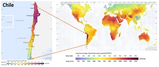 - Solargis. Solar Resource Maps of Chile. Photovoltaic Electricity Potential. © 2020 The World Bank, Source: Global Solar Atlas 2.0, Solar Resource Data: Solargis. Available online: https://solargis.com/es/maps-and-gis-data/download/chile (accessed on 28 November 2022).