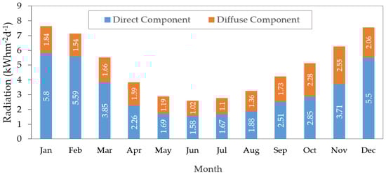 Solar energy is the energy that comes from the sun; it is a type of non-conventional renewable energy (NCRE), where the sun’s radiation can be used for photovoltaic conversion, to obtain electricity. In photovoltaic technology, global solar radiation is directly converted into electricity by the photoelectric effect []. A PV system is composed of panels or modules, which may be fixed or tracked, a control and power conditioning system, and sometimes an energy storage system (batteries), and may or may not be connected to the grid.