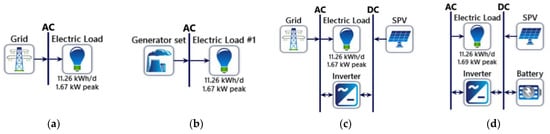 Homer Pro is software that can simulate the engineering and economic feasibility of the microgrids or the distributed energy systems that are off-grid or connected to an unreliable grid, as well as to build the least expensive energy and power systems and risk mitigation techniques []. Users can create standalone and networked systems to examine the performance, based on the technology feasibility and resource availability, as well as use the software’s knowledge on the most cost-effective combination of conventional and renewable energy, storage, and grid resources (where available). Homer Pro, moreover, takes the given system configuration, the capital and the maintenance costs of the various system components, and the size of each component into account, in order to maximize the net capital cost of the overall system, while satisfying the load requirements []. In order to initiate a simulation with Homer Pro, a baseline system architecture is required, depending on the case study.