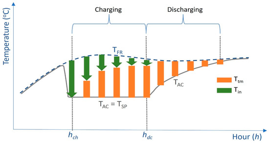 To give a graphical illustration of the relationship between temperature variables TFR, TAC, Tin, and Ttm, a time-series (hourly) plot illustrating their typical behaviour during the cooling period is presented in Figure 1. The cooling period consists of two phases, the charging phase and the discharging phase, where hch is the first hour of the charging phase and hdc is the first hour of the discharging phase. During the charging phase, electrical energy (EEin) is consumed by the AC unit and cooling energy is injected into the thermal zone. During the discharging phase, no new cooling energy is injected and Ttm decays over time. Tin is represented by the green arrows and Ttm by the orange bars.