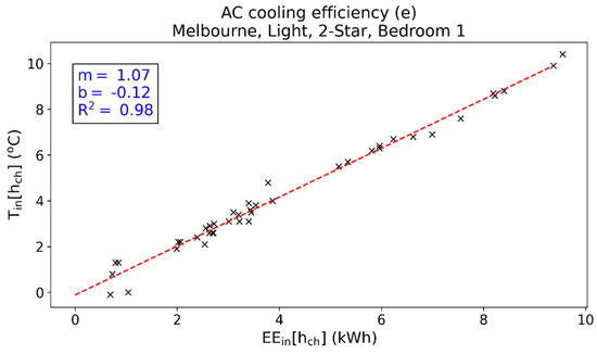 where em and ei are the slope and intercept, respectively, of the AC cooling efficiency (e), CoP is the coefficient of performance of the AC unit, and h is the hour. As Tin = TFRAC at h = hch, this linear relationship indicates that TFRAC is a measure of the cooling energy in the thermal zone. The average R2 value of this linear relationship for all template homes is 0.93. Table A2 in Appendix A gives the AC cooling efficiency R2 values for all template homes. As an example, Figure 2 gives the scatter plot of EEin versus Tin for Bedroom 1 in template home M2L.