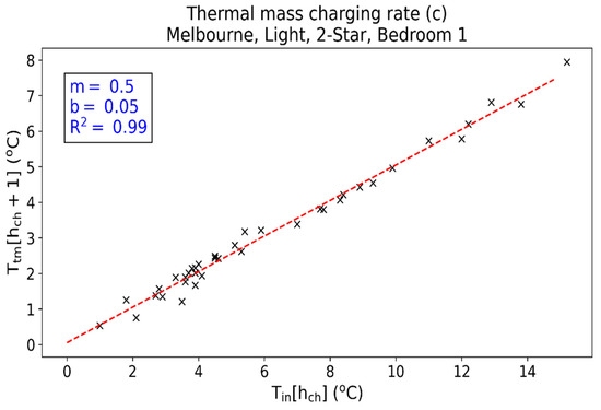 where cm and ci are the slope and intercept, respectively, of the thermal mass charging rate (c). Equation (2) represents the rate in which the thermal mass is charged with cooling energy. The average R2 value of this linear relationship for all template homes is 0.9. Table A3 in Appendix A gives the thermal mass charging rate R2 values for all template homes. As an example, Figure 3 gives the scatter plot of Tin[hch] versus Ttm[hch + 1] for Bedroom 1 in template home M2L.