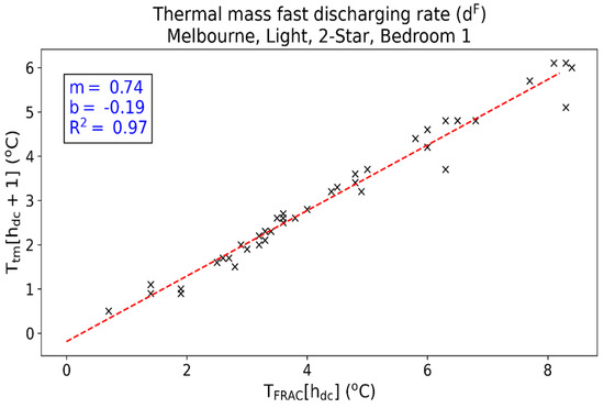 where and and are the slope and intercept, respectively, of the thermal mass fast discharging rate (dF). Equation (3) represents the rate at which cooling energy is discharged from the thermal mass at h = hdc. The average R2 value of this linear relationship for all template homes is 0.91. Table A4 in Appendix A gives the thermal mass fast discharging rate R2 values for all template homes. As an example, Figure 4 gives the scatter plot of TFRAC[hdc] versus Ttm[hdc + 1] for Bedroom 1 in template home M2L.
