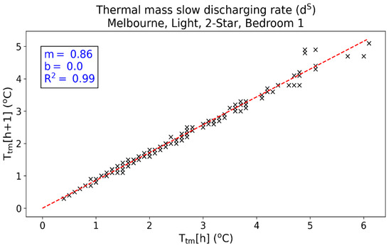 where and are the slope and intercept, respectively, of the thermal mass slow discharging rate (dS). Equation (4) represents the rate at which cooling energy is discharged from the thermal mass for h > hdc. The average R2 value of this linear relationship for all template homes is 0.99. Table A5 in Appendix A gives the thermal mass slow discharging rate R2 values for all template homes. As an example, Figure 5 gives the scatter plot of Ttm[h] versus Ttm[h + 1] for h > hdc for Bedroom 1 in template home M2L.