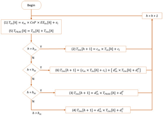 Equations (1)–(6) can be used to calculate Ttm and TFRAC at any hour of the charging or discharging phase. A flowchart describing the process for implementing the model is given in Figure 6. The flowchart shows that EEin is the only input from the AccuRate dataset used to implement the model. Neither TFR nor TAC are required, which is evidence that the model is temperature-independent.