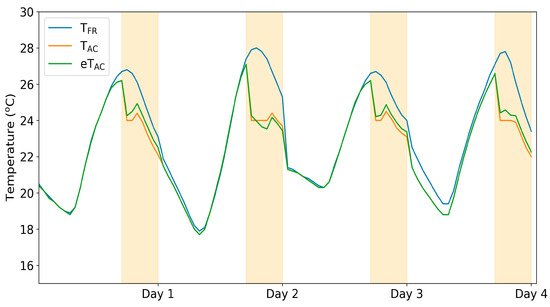 Time series of the free-running temperature (TFR), air conditioned temperature (TAC), and the estimated air conditioned temperature (eTAC) for four days for template home M2L. The light orange boxes highlight the periods of charging and discharging.