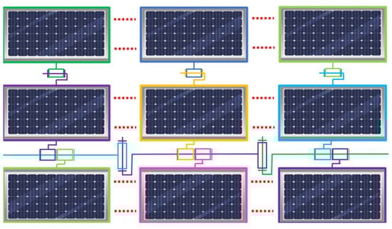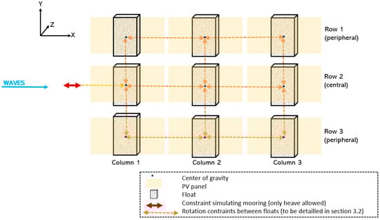 In order to understand the interactions between floats and to limit the computation time, an island composed of nine floats (three rows and three columns) is considered. As illustrated in Figure 2, waves propagate from left to right, along the X-axis. Floats and PV panels are defined as per the properties given in Table 1.