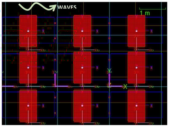 OrcaFlex representation of a 3 × 3 island (top view). Floats are in red and panels are in blue. Waves propagate along the X-axis (from left to right).