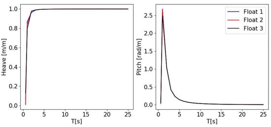 The conditions described in Table 2 are considered, first as a regular Airy wave approximation. This means that the regular waves have the following properties: and The results are presented in Figure 9, Figure 10 and Figure 11 for the central float. All the motions are recorded at the centres of gravity of the floats.