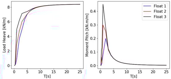 First, RAOs (response amplitude operators) of model R are investigated. The main load and displacement RAOs are depicted in Figure 7 and Figure 8 for the three floats of the central row. Number 1 is the first float impacted by waves and number 3 is the last. Heave is quite similar between all three floats, although pitch is slightly higher for the middle float. Load (and moment) shows great differences. During low periods, float 1 always has the lowest load and moment compared to float 3, which has the highest (almost twice as high). Float 2 stands in-between. During high periods, all three floats stabilise around the same values. Hence, although the motion responses of all the floats are similar, waves will induce forces with a greater magnitude on the last float. It is assumed that this is due to interactions between floats that induce stronger effects on the last float. This illustrates the complexity of hydrodynamic interactions between floats that are only accounted for in the R model (which includes multi-body calculations on OrcaWave).