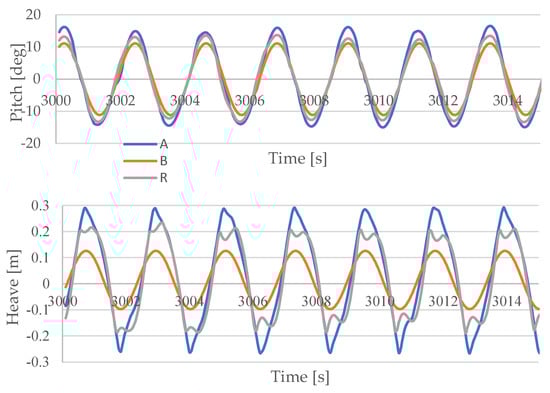 Figure 9 shows that pitch motion is very similar for all models, although model A overestimates the motion amplitude compared to the reference R. Model B underestimates it.