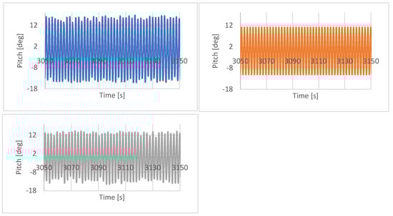 Pitch for case A (top left), case B (top right) and case R (bottom) on the central float in regular waves.