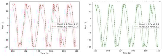 The conditions described in Table 2 are considered for irregular waves. Pitch and heave plots are presented in Figure 13 for all three modelling strategies and for the central float. All the motions are recorded at the centres of gravity of the floats.