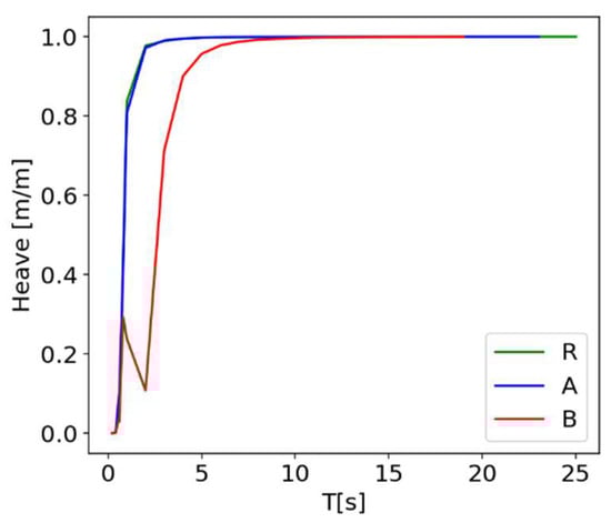 Heave RAOs for cases A, B and R for the central floater.