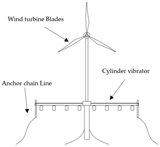 The overall structure of a Spar-type floating wind turbine is a deep-draft slender cylinder, which mainly consists of two parts: a floating chamber and a ballast chamber [5]. The stability of this device is maintained by uniformly distributed mooring cables connected to the seabed, so this structure not only provides the wind turbine as a whole with a large recovery moment and high inertia resistance in both the transverse and longitudinal rocking directions, but also reduces the vertical swing motion, which greatly improves the floating wind turbine in terms of water anti-tilting stability. The research in this paper is mainly based on the wind–wave combined power generation system with a Spar-type wind turbine as the main structure. By installing a VIV power generation device on this device, both wind and wave energy can be utilized, and the cost can be reduced to improve the overall economic efficiency.