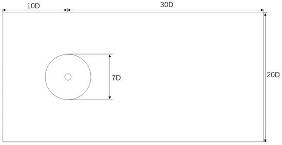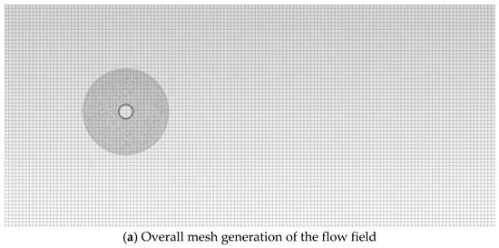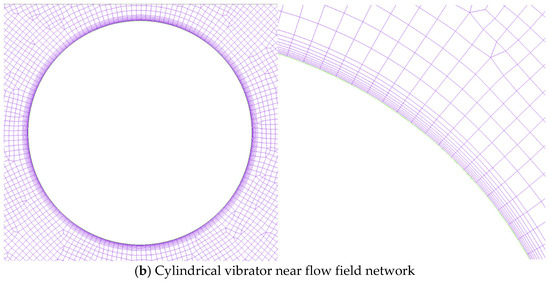 Figure 3 and Figure 4, for the two-dimensional cylindrical oscillator vortex-induced vibration of the schematic diagram and the flow field grid computing area, respectively, show a cylindrical stator D = 0.1 m diameter, an area calculation of 20 D × 40 D, a speed entrance D from the center position for 10 D from the center of the circle pressure exits for 30 D, the upper and lower boundary sliding types from the center of the circle to 10 D, and a cylinder for the non-sliding mode surface boundary. To consider the application of a dynamic grid in the numerical simulation of vortex-induced vibration, a random grid with a diameter of 7D is set around the cylindrical oscillator. The random grid is structured, and the other areas are unstructured. In the near-wall treatment, ten layers of boundary layers are set, and the mesh height of the first layer corresponds to one, as shown in Figure 4b. Since the dynamic grid technology is used in the numerical simulation, grid-independent verification is needed. In this paper, the vortex excited motion of a cylinder with a reduced velocity is 5, which was tested under the condition of = 2.6 and two-way natural frequency = = 0.38 Hz. Grid-irrelevance verification results are shown in Table 2. Grid B is selected as the optimal scheme through comparison.