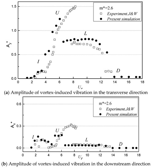 Figure 5 compares the dimensionless amplitudes with the experimental results at different reduction speeds. As can be seen from Figure 5a, the variation trend of the curve of dimensionless transverse flow amplitude, obtained by numerical simulation, is the same as that obtained by experiment, showing the initial branch (I), upper branch (U), lower branch (L), and desynchronization (D).