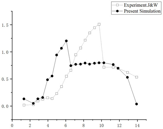 As shown in Figure 5b, the trend of the dimensionless forward flow amplitude curve obtained by the numerical simulation is basically consistent with that obtained by the experiment, except that the forward-flow amplitude of the upper branch is somewhat underestimated. The reasons for this situation are as follows: in the upper branch, the vibration amplitude of the cylindrical oscillator is relatively large, which attenuates the axial correlation of the cylindrical oscillator. In the numerical simulation of two-dimensional cylindrical oscillators, it is assumed that their axial directions are completely correlated [11]. In addition, the numerical simulation uses the Reynolds averaging method, which does not account for the random disturbances in the flow field [19,20]. By comparison, it can be concluded that the application of numerical calculations can better simulate the VIV of cylindrical oscillators, but there is an underestimation in terms of the maximum amplitude peak.