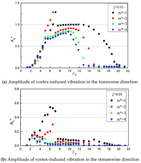 Figure 7 gives the variation law of the dimensionless vortex vibration amplitude with the reduced velocity for cylindrical oscillators with different mass ratios. Compared with the four different mass ratios of cylindrical oscillators, the crossflow vortex-induced vibration amplitude shows a trend of increasing and then decreasing with the increase in the reduced velocity, while the crossflow amplitude responses of cylindrical oscillators all show the initial branch and the lower branch.