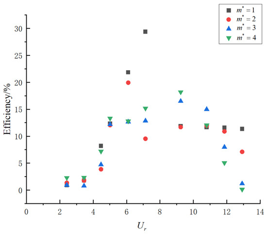 Figure 8 shows that the energy-acquisition efficiency of cylindrical oscillators with mass ratios of one and two increases with the increase in the reduced velocity, when the reduced velocity is less than seven, and it decreases otherwise. For cylindrical oscillators with mass ratios of three and four, the maximum energy acquisition efficiency appears in the range of reduced velocity from eight to ten. In general, the energy acquisition efficiency of cylindrical oscillators increases with the increase in reduced velocity and then decreases gradually. Under the condition of the same reduction speed, the smaller the mass ratio, the higher the capacitive efficiency.