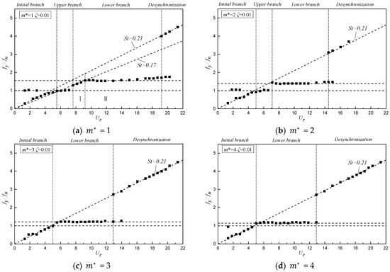 From Figure 9, it can be seen that in the initial branch, the cylindrical oscillator with mass ratios of one and two appears as the upper branch, and the corresponding is locked near one; meanwhile, the cylindrical oscillator with mass ratios of three and four has only the initial branch and the lower branch without the upper branch, and the corresponding is not locked near one. The cylindrical oscillator with a mass ratio of one has a transition region between the upper branch and the lower branch, and the Strouhal number in this region is 0.17, as Figure 9a shows. However, this transition region does not appear in the frequency ratio curves of other mass-ratio cylindrical oscillators. In the lower branch, the corresponding to different mass ratios is different and tends toward one as the mass ratio increases.