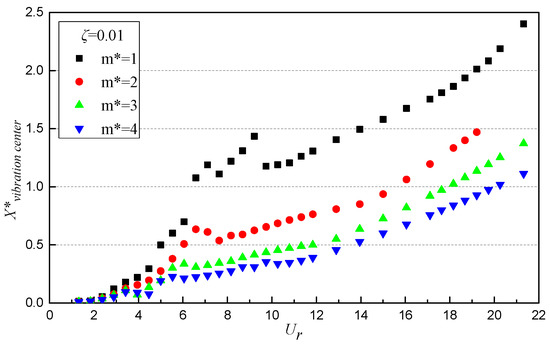 Figure 10 shows the variation in the equilibrium position of cylindrical oscillators with different mass ratios along the streamwise direction as a function of the reduced velocity. It can be seen from the figure that in the transition region between the upper branch and the lower branch of the cylindrical oscillator with a mass ratio of one, the equilibrium position in the streamwise direction suddenly decreases; it does not increase with the increase in the reduction speed but decreases initially and then increases. At the same reduction speed, the difference between the equilibrium positions with mass ratios of one and two is significantly larger than that with mass ratios of three and four, and this phenomenon is more obvious at higher reduction speeds. In the lower branch, the adventitial equilibrium position changes with the reduction speed [11].