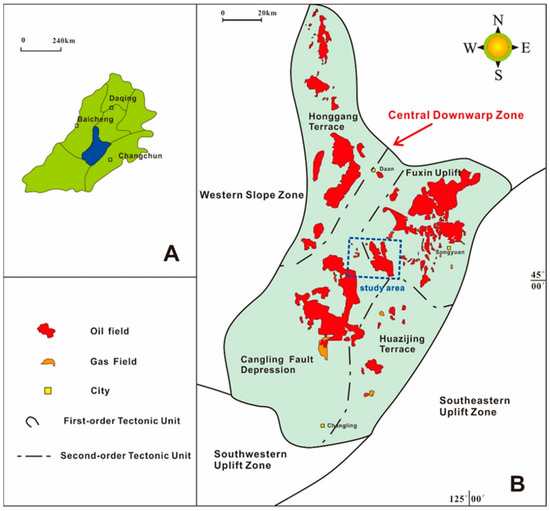 Location of the studied area in the Songliao Basin [8]. (A) Location of the southern part of the Songliao Basin (blue-filled area); (B) tectonic sub-division of the southern part of the Songliao Basin and the study area.