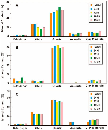 Mineralogy variation during different stages of CO2-water-sandstone interaction experiment. (A) Sample A-130; (B) Sample Q-147; (C) Sample Q-148.
