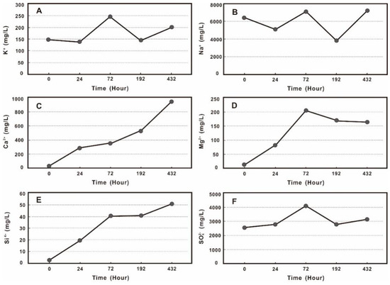 The changes of typical ions during the experiments (A—K+; B—Na+; C—Ca2+; D—Mg2+; E—Si4+; F—SO42−).