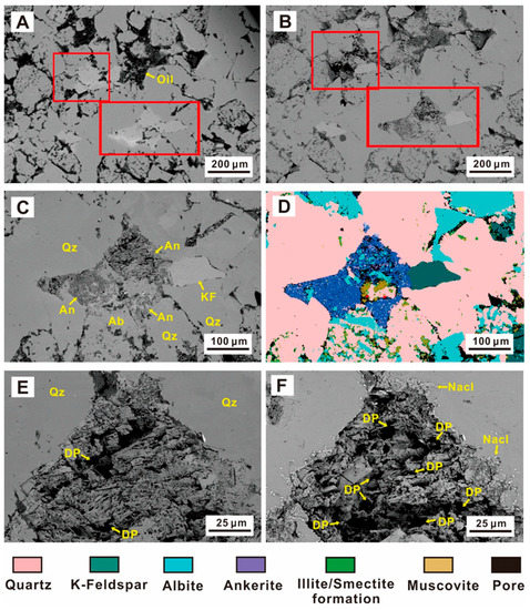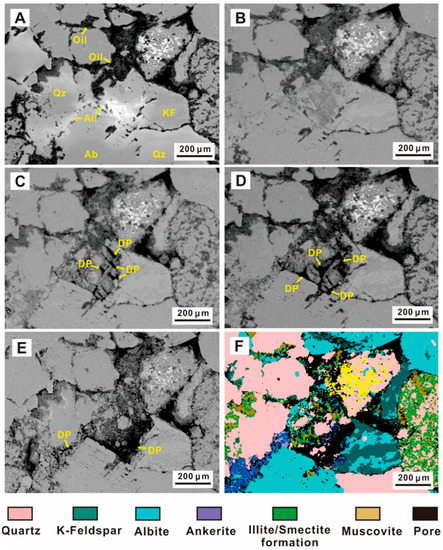 SEM images of ankerite dissolution during the experiment. (An—ankerite, Ab—albite, KF—K-feldspar, DP—Dissolution pores). (A) The initial sample; (B) The sample after 24 h, with no observable dissolution; (C) Holes formed due to dissolution after 72 h; (D) After 192 h, the dissolution pores became larger. (E) After 432 h, a large area of ankerite was dissolved; (F) QEMSCAN mineral analysis.