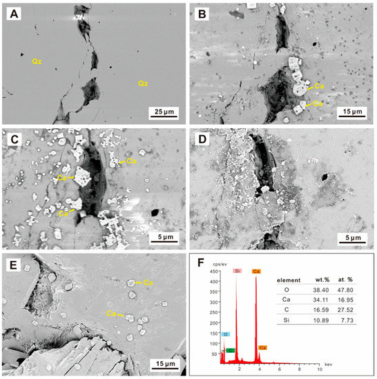 SEM images of calcite precipitation (Qz—quartz, Ca—calcite). (A) The initial sample; (B) Newly formed calcite on the sample’s surface after 24 h; (C) The newly formed calcite was dissolved after 72 h; (D) The sample at the end of the 432 h; (E) Calcite was found in other locations at the end of the 432 h; (F) The EDS analysis verified the calcite in (B).
