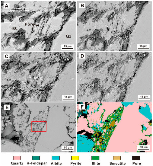 SEM images of the illite-smectite mixed layer during the experiment (Qz—Quartz, I/S—illite-smectite mixed layer) (A) initial sample; (B) After 24 h; (C) After 72 h; (D) After 432 h; (E) large-scale clay mineral map after 432 h; (F) QEMSCAN mineral analysis.