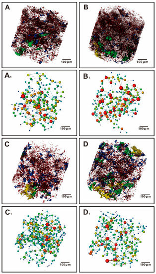 Three-dimensional model of pore system for samples A-130 and Q-148: (A) pore space of sample A-130 before experiment; (B) pore space of sample A-130 after the experiment; (C) pore space of sample Q-148 before experiment; (D) represents the pore space of the Q-148 after the experiment. The red parts represent pores with an equivalent diameter of 0–20 μm, the blue parts represent pores with an equivalent diameter of 20–50 μm, the green parts represent pores with an equivalent diameter of 50–100 μm, and the yellow parts represent pores with an equivalent diameter of 100 μm~200 μm. (A1) Pore connectivity of sample A-130 before the experiment, (B1) Pore connectivity of sample A-130 after the experiment; (C1) Pore connectivity of sample Q-148 before experiment; (D1) Pore connectivity of sample Q-148 after the experiment. The red, yellow, green, and blue represent the strong to weak connectivity between pores.
