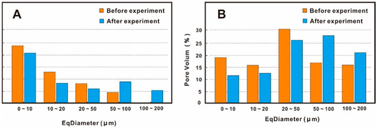 The differential evolution of minerals has led to the variation of the microscopic pore structure of the reservoirs [27]. It can be seen from the SEM that the carbonate minerals represented by ankerite are dissolved into pores. At the same time, micro-particles migrated and precipitated after dissolution, which blocked the original pore system of clay minerals such as the illite-smectite mixed layer. This study selected two relatively tight samples to reconstruct the three-dimensional pore structure before and after the experiment using the micron CT and quantitatively analyzed the pore data. The results show that the proportion of pore volume with an equivalent diameter of 0–50 μm in the total pore volume increased after the experiment, while the proportion of pore volume with an equivalent diameter of 50–200 μm in the total pore volume decreased after the experiment. This illustrates that the dissolution accounted for by CO2-water-rock interaction in the study area has more influence on the pore structures than the precipitation of micro-particles, and mineral dissolution is the main reason for the increase of the pore volume and the connectivity between the pores of the sample after the experiment. It should be noted that we found that carbonate minerals showed the greatest change in the water-rock interaction. However, due to the relatively low content of these minerals, the physical properties of the samples did not change significantly before and after the experiment.