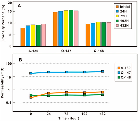The impact of different CO2 water-rock interaction time on the physical properties of the reservoir was also different. Taking sample A-130 as an example, the relative change ratio of physical properties was obvious in the early stage and not so obvious in the later stage. The increase in porosity was 12.53%, and the permeability increase was 40.43% from the initial state to the 24th hour; the relative change in porosity was 4.71% from 24 h to 72 h, with a corresponding permeability change of 16.7%. The physical properties of the samples were relatively stable at 72 h. After 192 h and 432 h, the changes in porosity were −1.12% and 4.12%, and the changes in permeability were −5.08% and 9.93%. The changes in physical properties of the sample at different interaction times for the three different groups were almost the same (Figure 11).