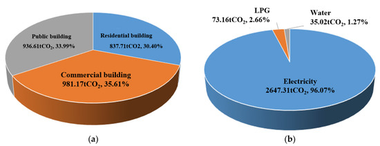 In 2021, the total carbon emissions of buildings in village Y were 2755.49 tCO2/a, and the total carbon emissions of per capita building energy re 2.58 tCO2/a. From the perspective of building type, as shown in Figure 1a, the total carbon emissions of residential buildings were 837.71 tCO2/a, commercial buildings were 981.17 tCO2/a, and public buildings were 936.61 tCO2/a. The contribution of commercial buildings, public buildings and residential buildings to the total carbon emissions of village Y were 35.61%, 33.99% and 30.40%, respectively. Carbon emissions per unit building area from high to low were public buildings, commercial buildings and residential buildings, which were 0.039 tCO2/m2, 0.036 tCO2/m2 and 0.012 tCO2/m2, respectively.