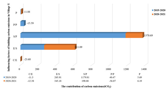 Population structure includes permanent population and floating population. Village Y has a well-developed tourism industry; the floating population is mainly tourists. Due to the impact of the pandemic, the number of tourists decreased from 900,000 person-times per year in 2019–2020 to 800,000 person-times per year in 2021, resulting in a decrease in the contribution rate of population structure to the carbon emissions of rural buildings from 2.73% in 2019–2020 to −11.83% in 2020–2021, showing a negative effect. Wang et al. found that the increase of carbon emissions in Beijing from 1997 to 2010 was mainly driven by changes in production structure and floating population growth [53].