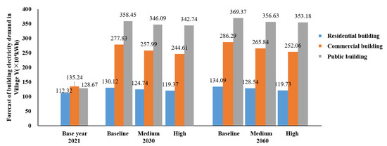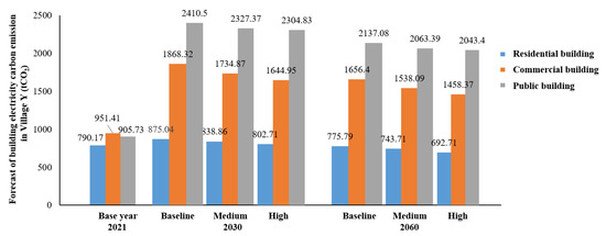 - In the baseline scenario, medium constraint scenario and high constraint scenario, the building carbon emissions in village Y during 2021–2060 showed a trend of increasing first and then decreasing. Under the three scenarios, the predicted values of building carbon emissions in village Y in 2030 are 5331.45 tCO2, 5067.04 tCO2 and 4908.04 tCO2, respectively. The predicted values of building carbon emissions in village Y in 2060 are 4701.71 tCO2, 4465.74 tCO2 and 4298.27 tCO2, respectively. This indicates that the control of building area growth scale and energy structure under the medium high constraint scenario will be conducive to energy conservation and emission reduction in the rural building field.