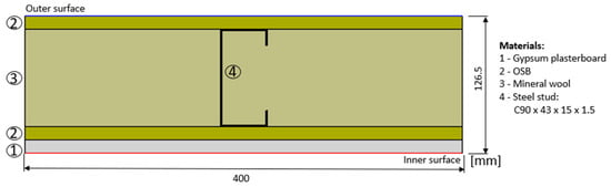 Only a representative bidimensional segment of the LSF walls’ cross-sections were modelled, as illustrated in Figure 1, for the reference LSF walls (400 mm width) in order to decrease computation time and effort. The materials’ thermal properties were previously presented in Table 1 and Table 2. The maximum error accepted on the FEM calculations was set to 2% for the models assessed in this work.