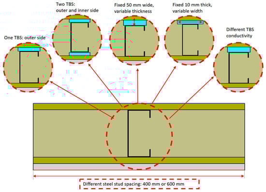 Table 1 displays the five evaluated parameters in this sensitivity analysis, as well as their respective values. These five parameters, which are also illustrated in Figure 2, were the TBS thickness, width, and thermal conductivity and number, as well as the steel studs’ spacing.